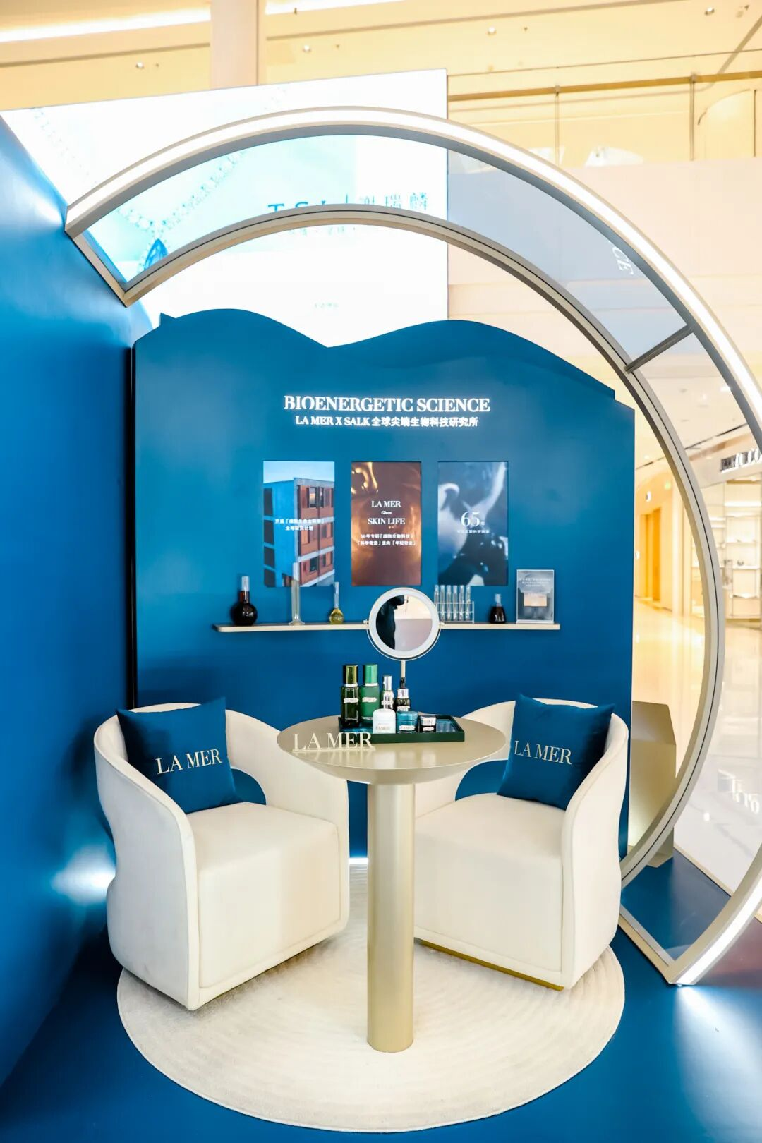 展位落位于一樓化妝區(qū)中庭黃金點(diǎn)位,以“細(xì)胞充能中心”為概念,通過深海藍(lán)主色調(diào)與未來感環(huán)形結(jié)構(gòu),打造“深海能量空間站”視覺焦點(diǎn)?,F(xiàn)場配置“煥能使者”,結(jié)合注冊會員贈定制絲巾等禮遇,引導(dǎo)消費(fèi)者體驗?zāi)芰扛兄剿?、生物科技煥能、?xì)胞新生定格、專屬奢愈四大沉浸板塊,深度解析產(chǎn)品抗老科技。